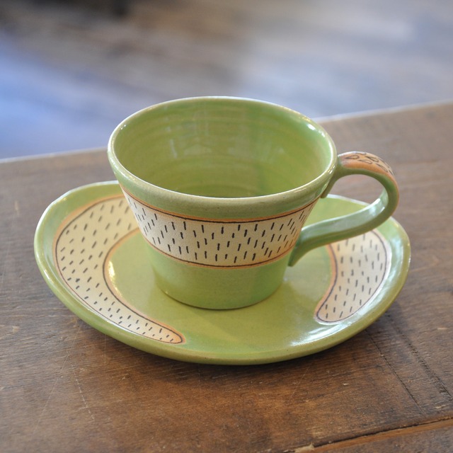 もえぎ色のカップに縦棒パターンがとてもかわいいアクセント。ソーサーはケーキ皿などにもご利用いただけます。 陶芸作家「双子堂」(沖縄読谷村) 沖縄の自然をモチーフにした作品は可愛らしいの一言!軽くて普段使いができると、使い心地も評判です。品薄が続いていますので、気になる方はお早めにチェックしてくださいね!