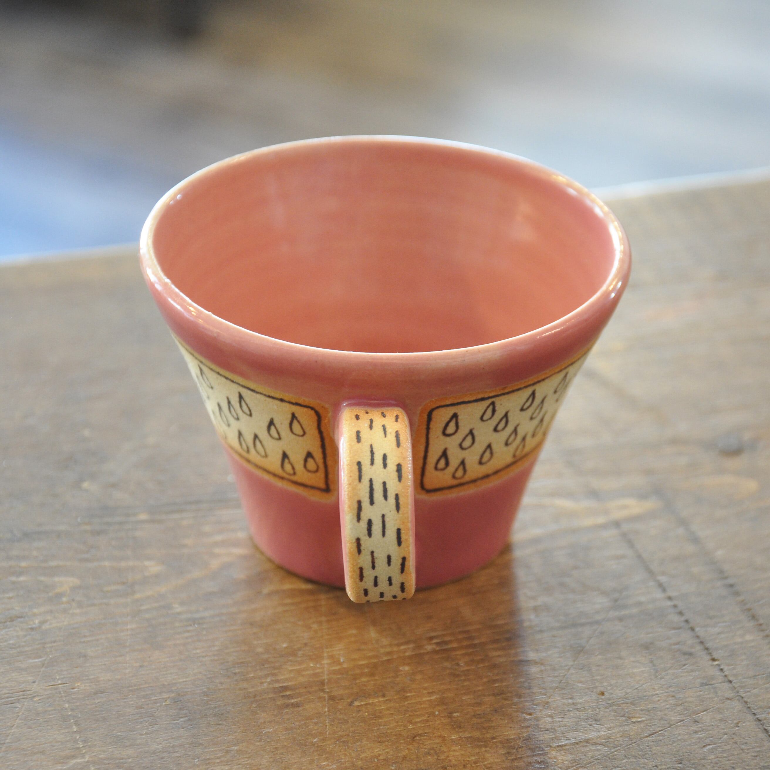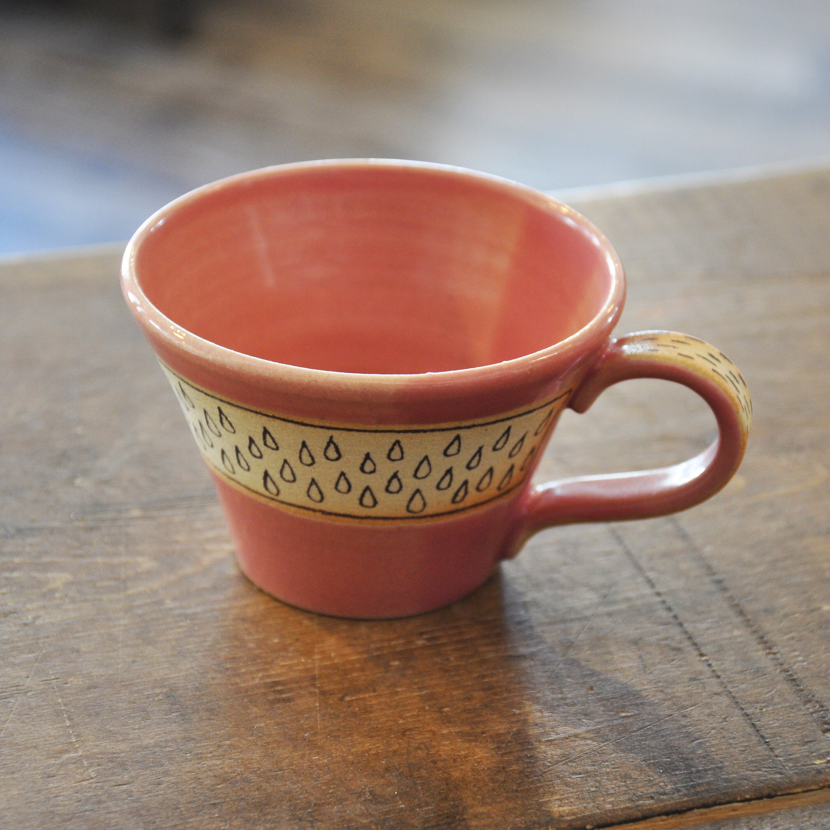 ピンク色のカップに水滴パターンがとてもかわいいアクセント。