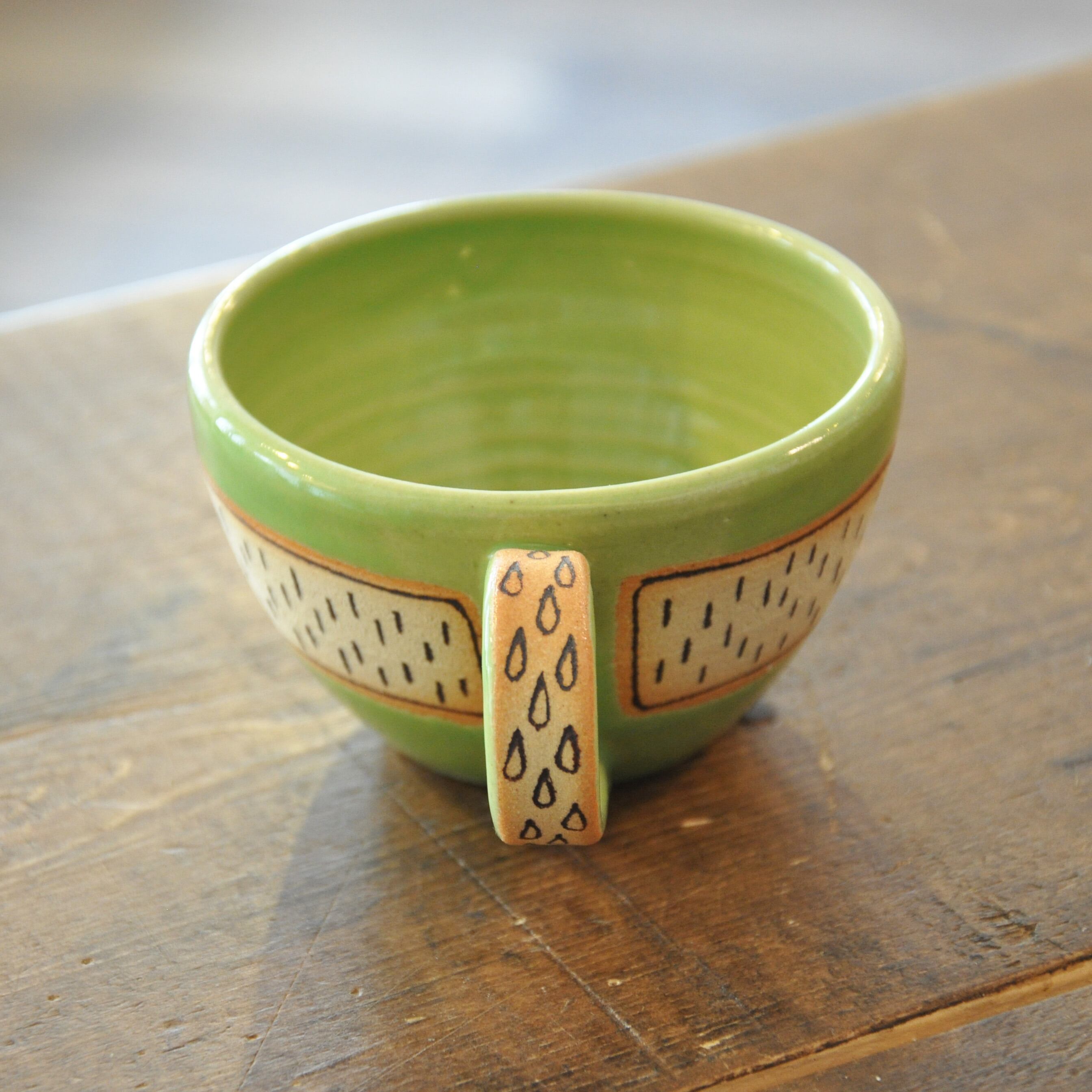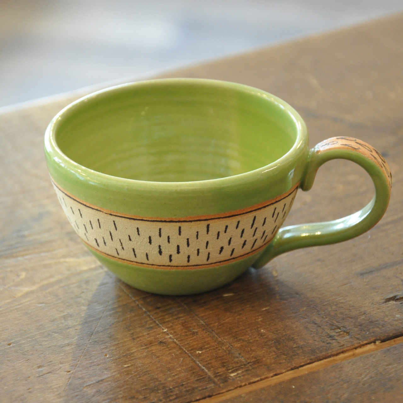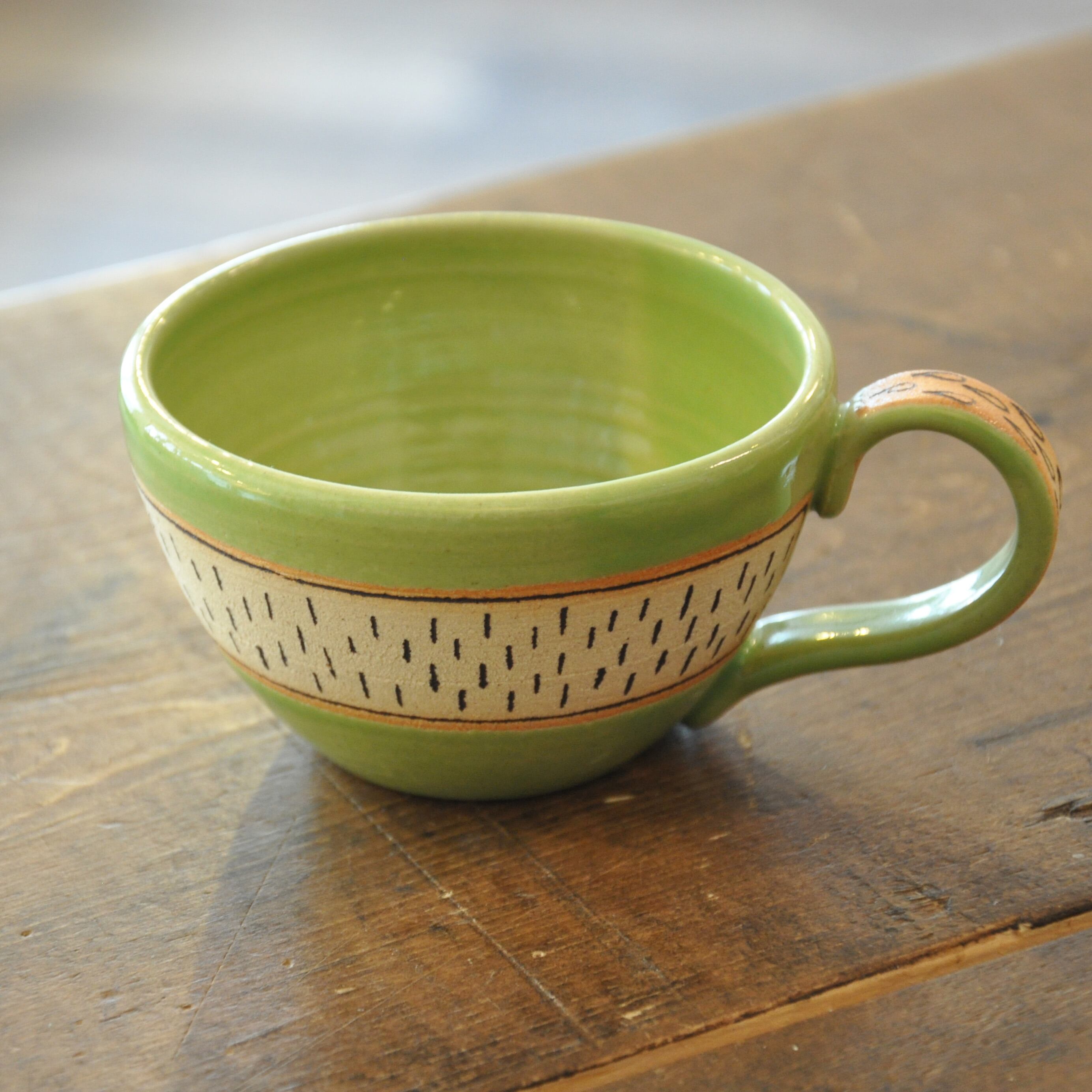 もえぎ色のカップに縦棒パターンがとてもかわいいアクセント。取っ手がしずくになっているのも見逃せません。陶芸作家「双子堂」(沖縄読谷村)